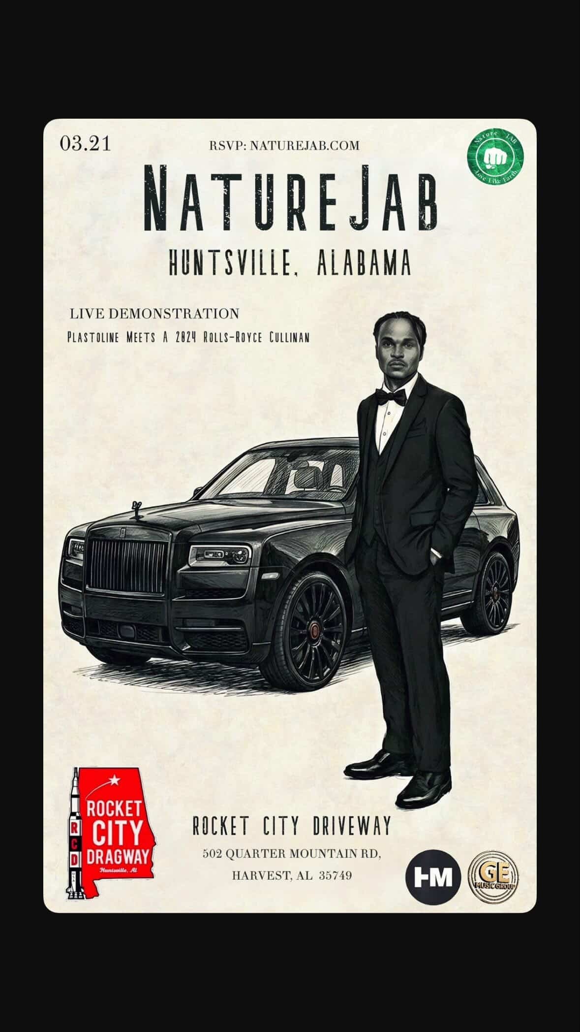 NatureJAB is searching for a Rolls Royce and other elite-caliber vehicles for the final Plastoline demonstration in Birmingham, Alabama on March 21st. This isn't a fill-up. This is a live proof-of-concept in front of millions. This is history.